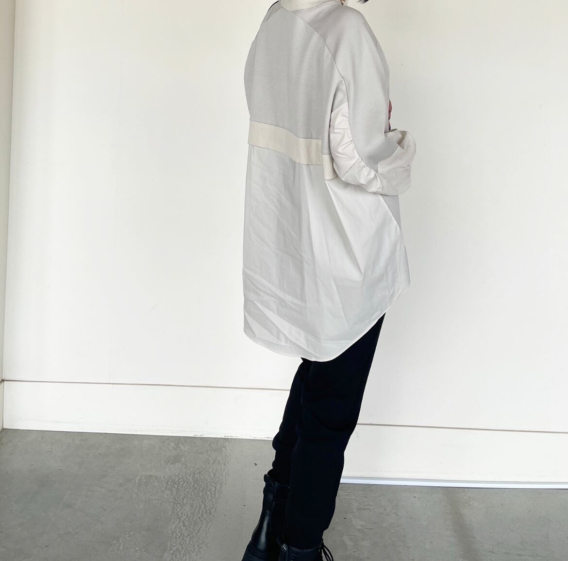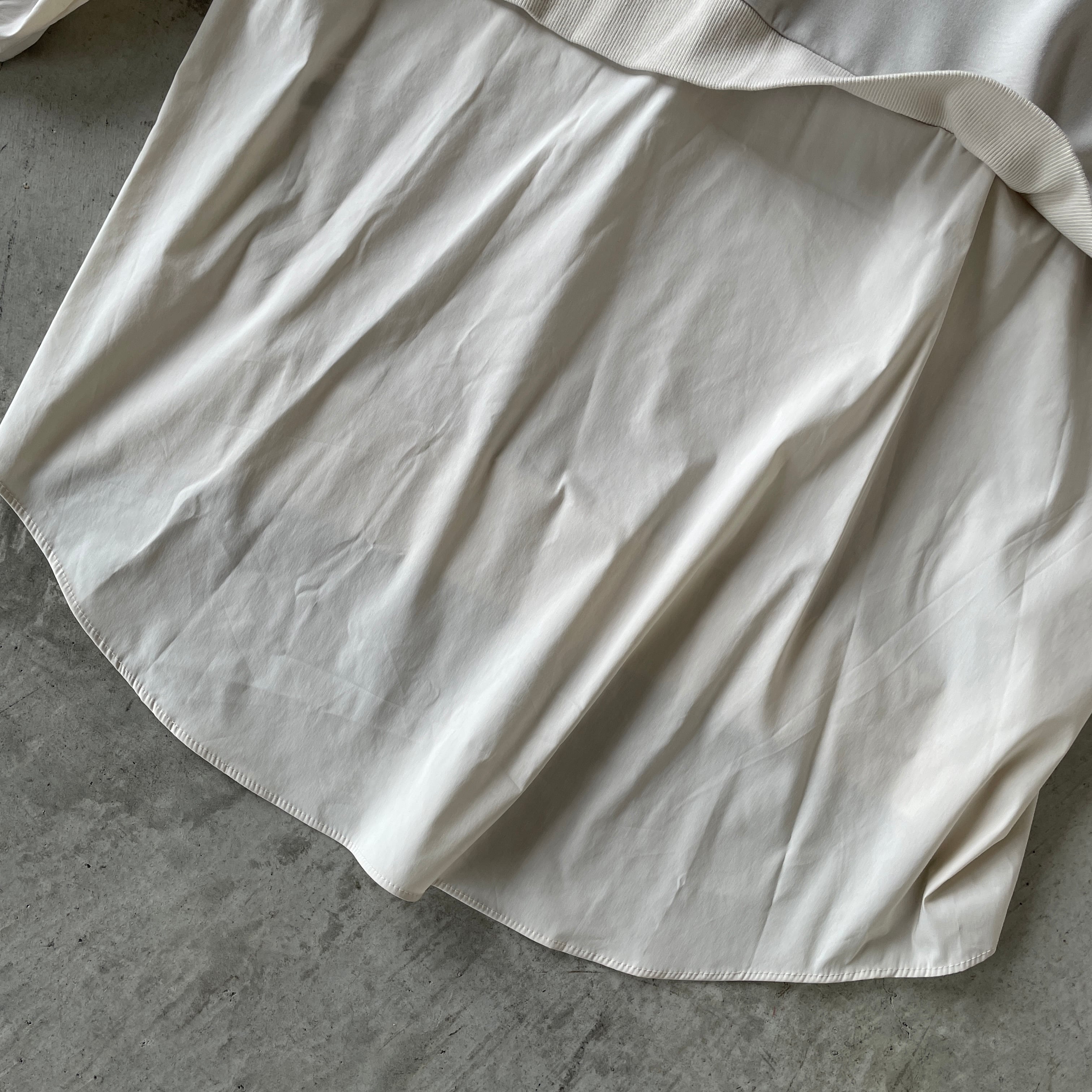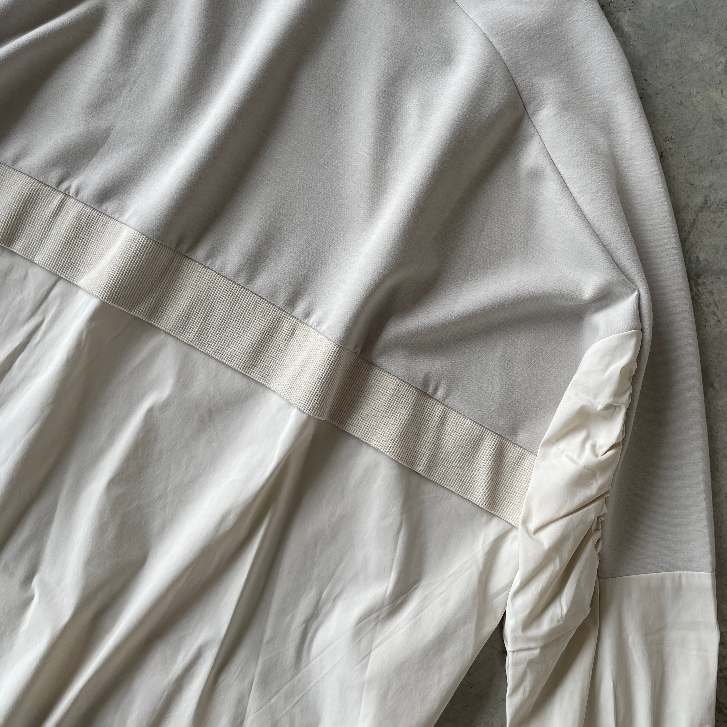 1枚でしっかり存在感あり♪柔らか素材で着心地も抜群◎♪ カット素材&布帛ドッキングプルオーバートップスです。