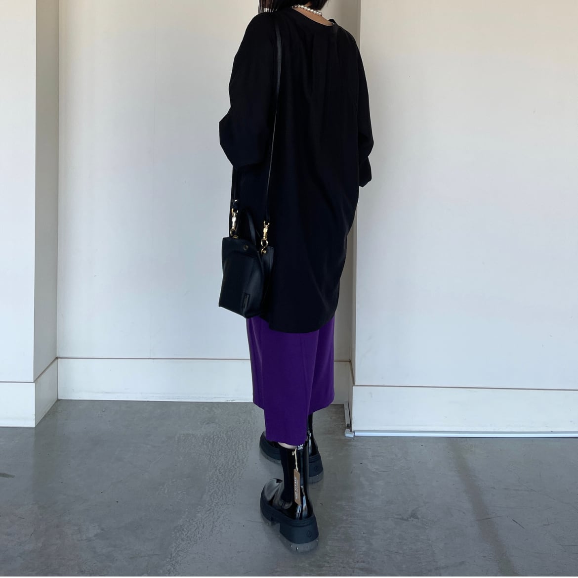 着丈にも前後差を付け、どんなボトムともバランス良く着こなせるシルエットになっています。