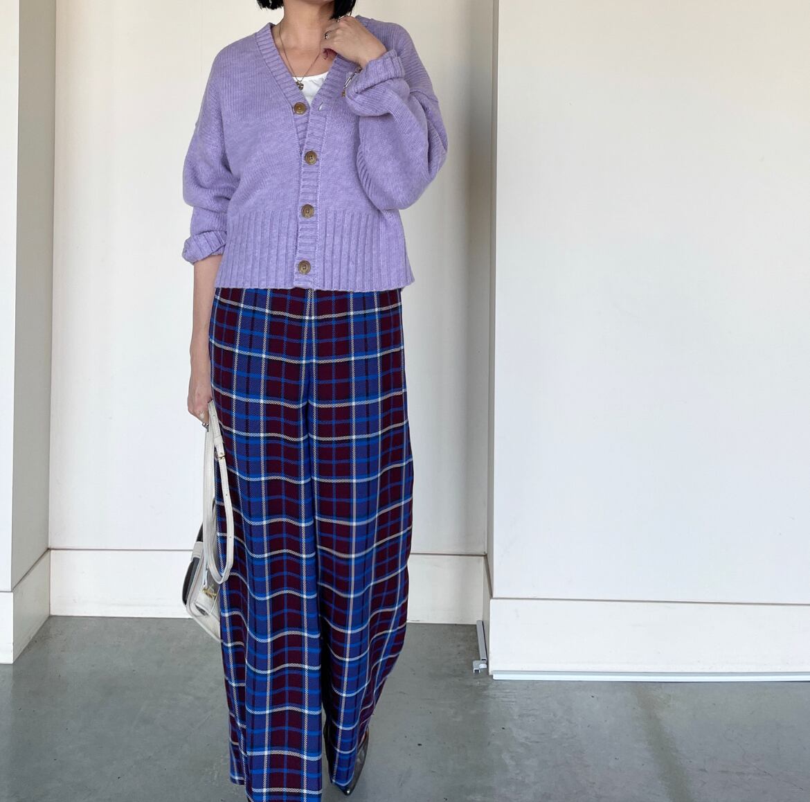 カーディガンは大胆なドロップショルダーにややゆとりのあるボリュームシルエットで抜け感がありつつも、深めのVあきで女性らしい雰囲気をプラス。