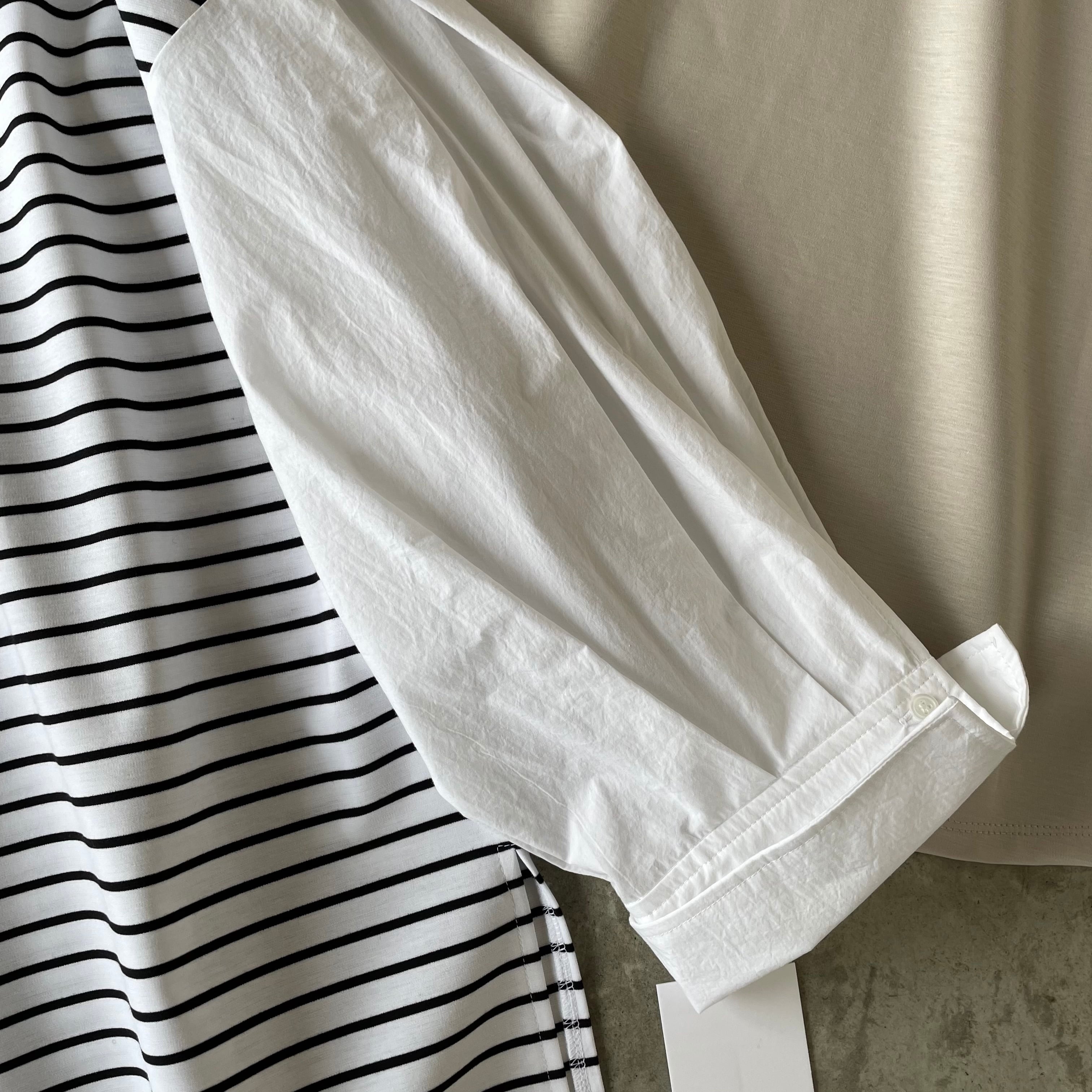 サイドスリットのカットソー素材に、布帛素材のボリュームスリーブの組み合わせがおしゃれポイントです。