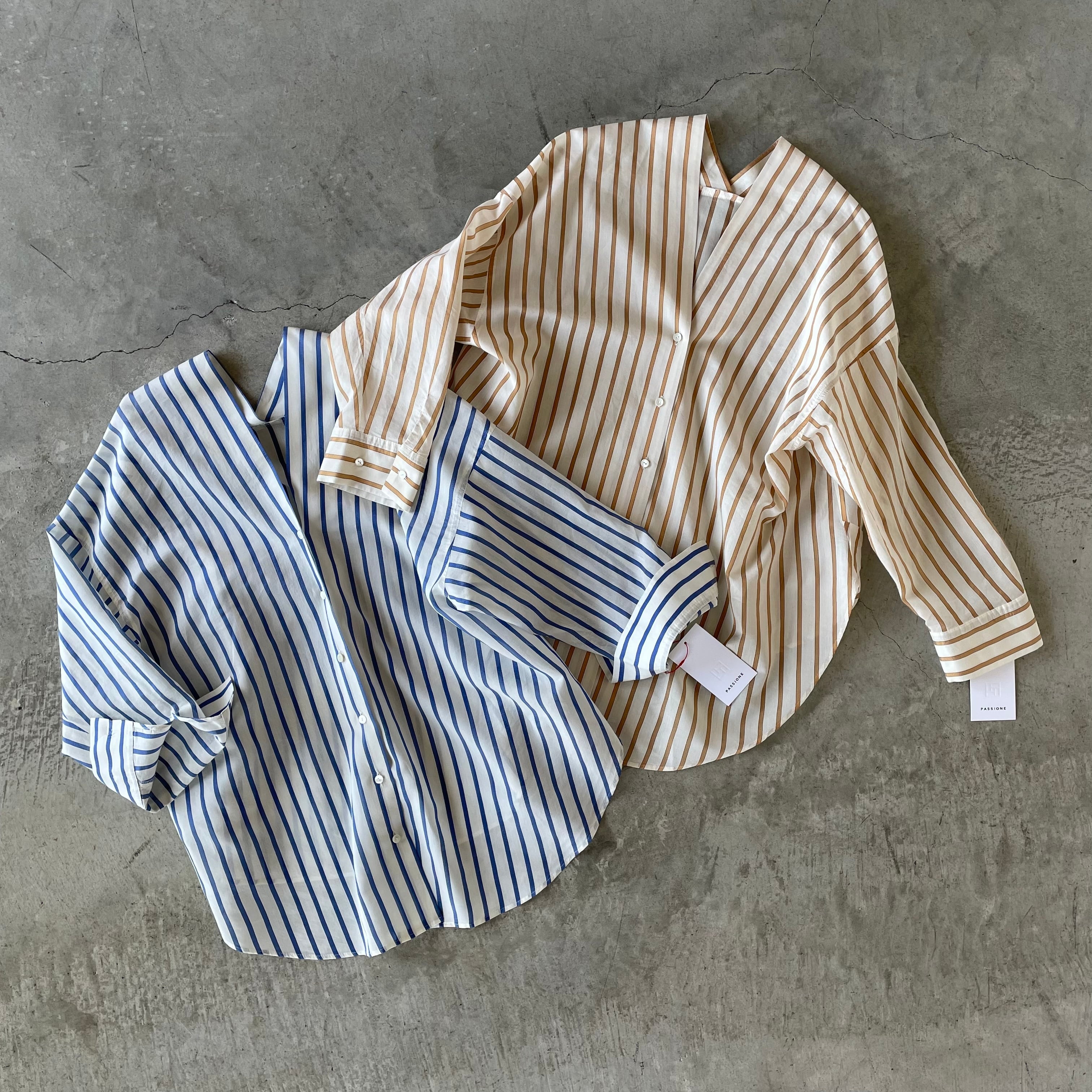 ストライプ柄でスタイリッシュに!サイドタックデザインがスタイリングを華やかに♪ ストライプVネックブラウス/PASSIONE パシオーネ