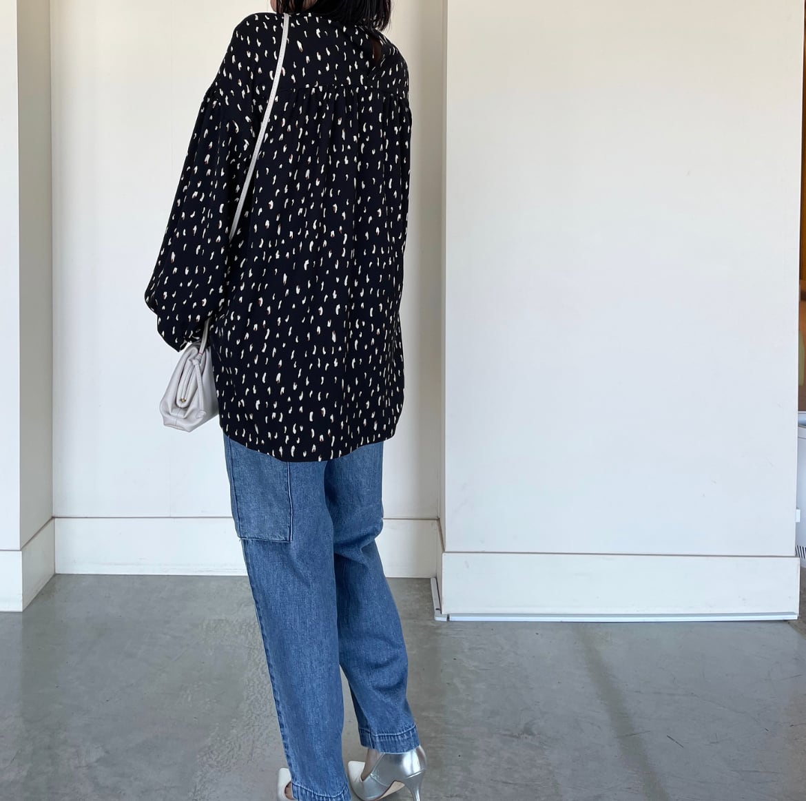 抽象的なランダムドットが目を引くヨークギャザーブラウス。