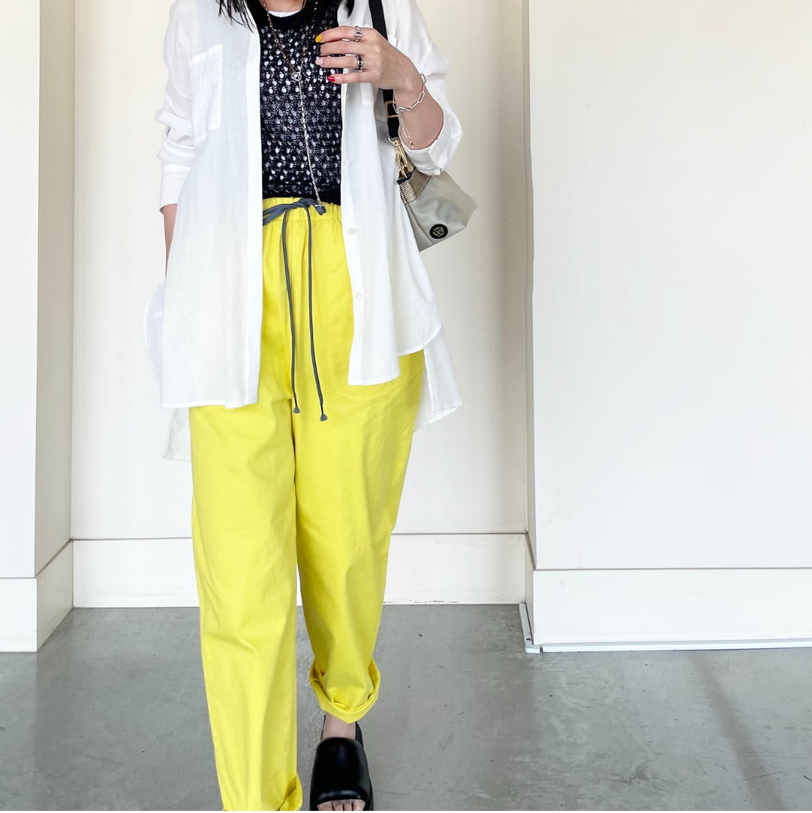 今回は鮮やかイエローパンツをポイントにスタイリング。