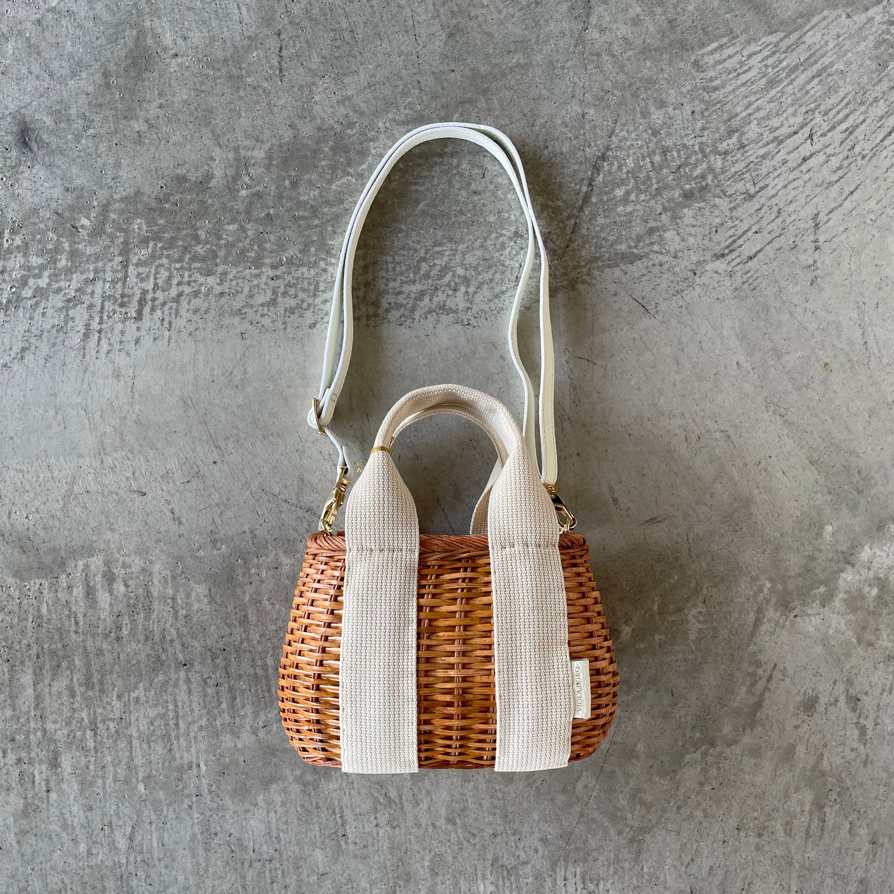ホワイトテープとスカーフがアクセントになったラタンバッグ。