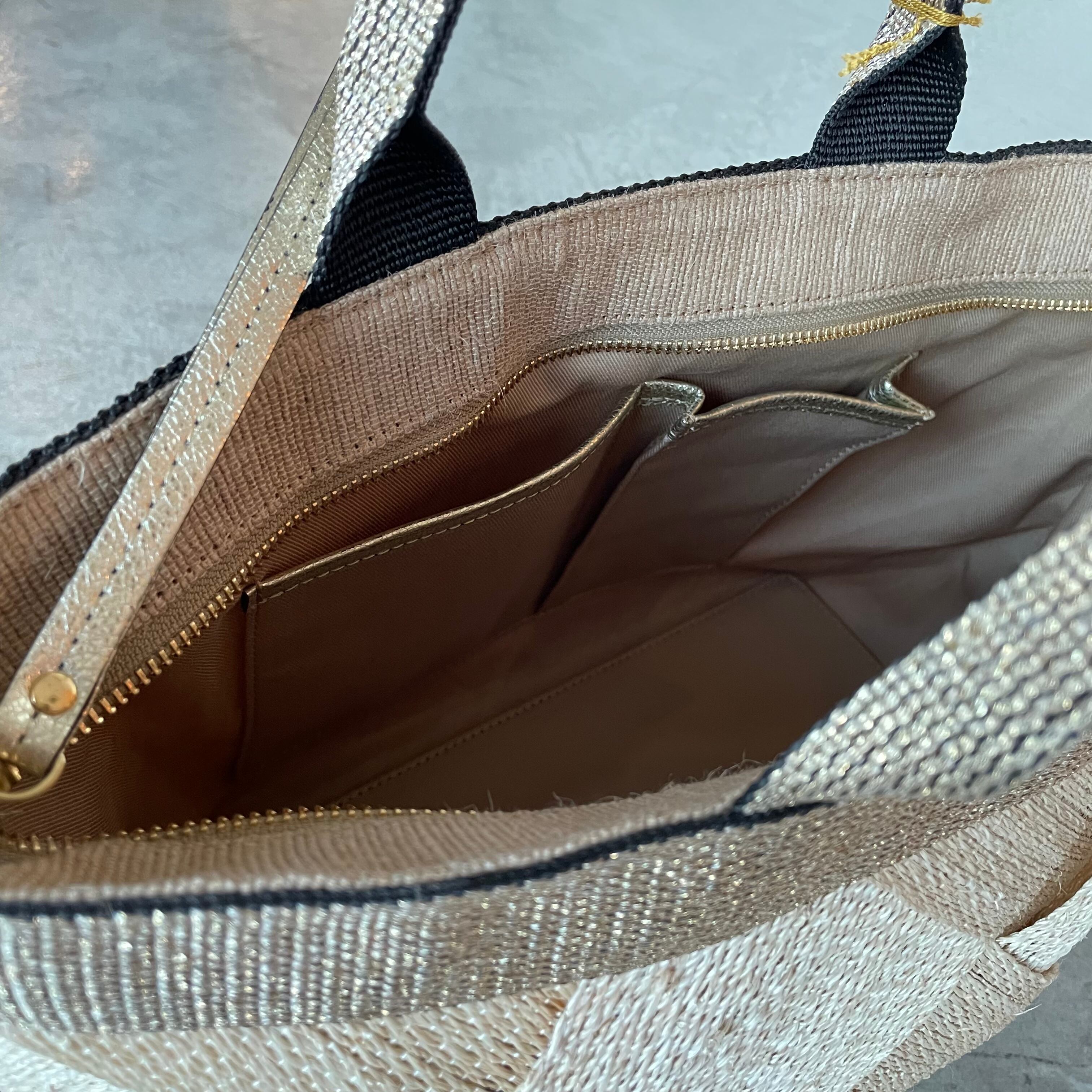 シンプルなフォルムにゴールドの綿テープにゴールドレザーのショルダーベルトが効いた、一点投入で気分もグッと上がるアイテム♪