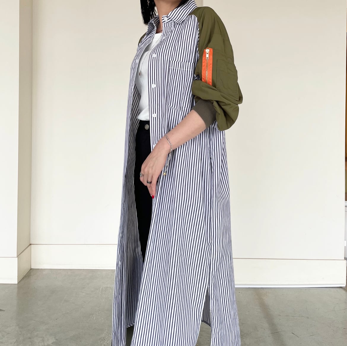 ミリタリーテイストとのコンビデザインが新鮮♪ ミリタリー×ストライプ サイドスリット ストライプロングシャツワンピースです。
