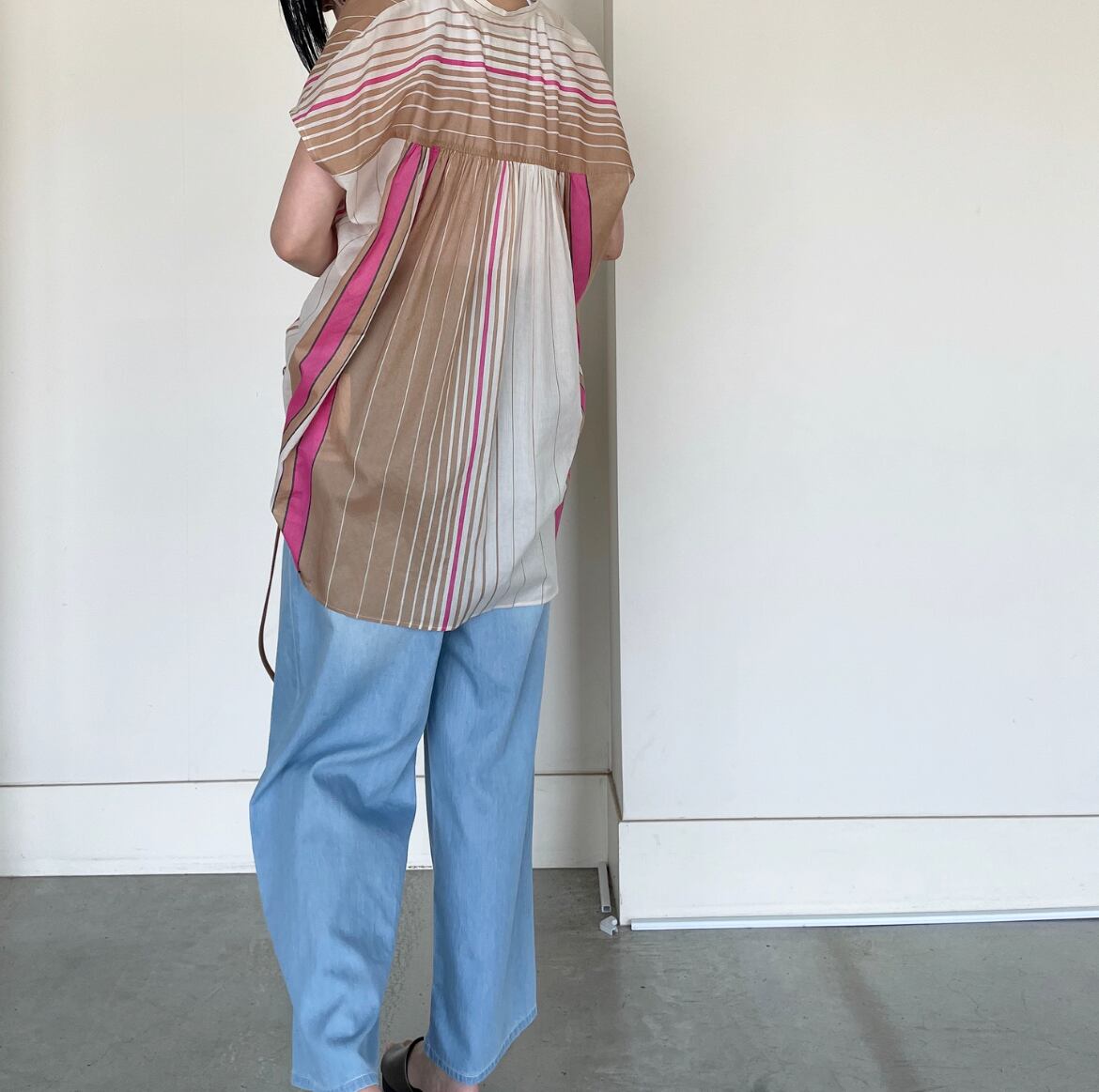 サラっと着るだけでもサマになる◎マルチカラーがポイント♪ マルチストライプバックギャザーシャツブラウスです。