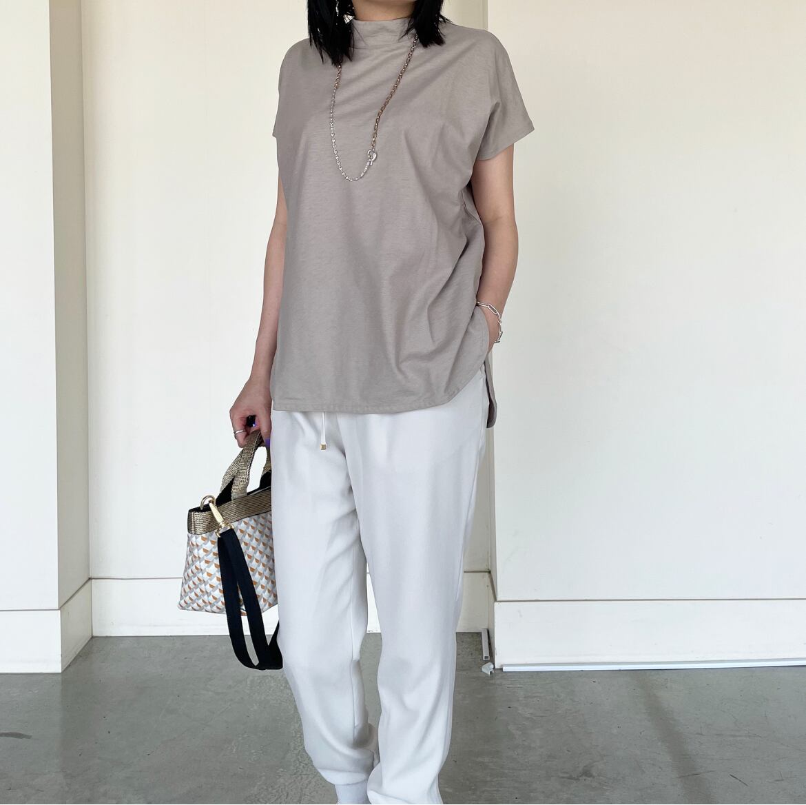Tシャツだけど洗練されたハイネックデザインで、オトナな夏コーデに挑戦してくださいね。