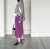 ゆったりめのシルエットなのでスカートならタイト系、パンツならテーパードなどすっきりとしたアイテムがオススメです。