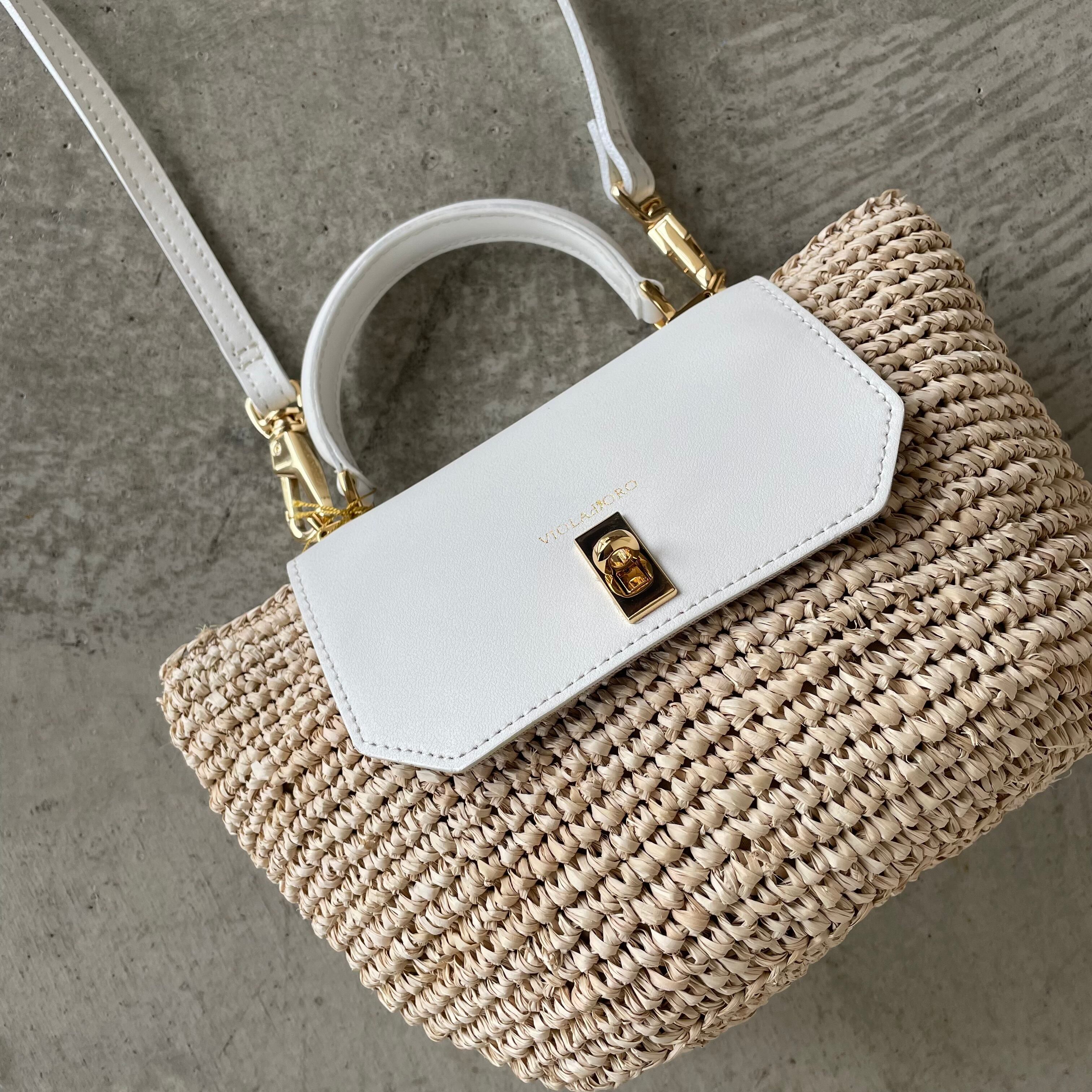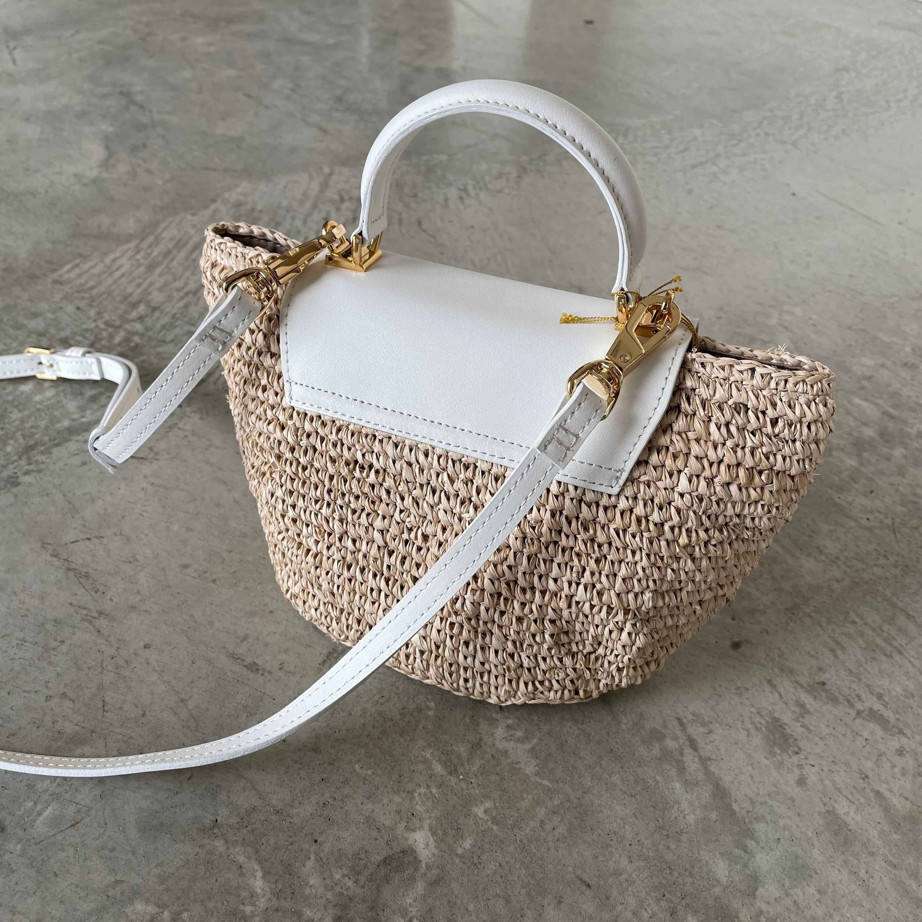 ホワイトレザーで夏の爽やかコーデ♪ ラフィア2WAYトップハンドルバッグです。