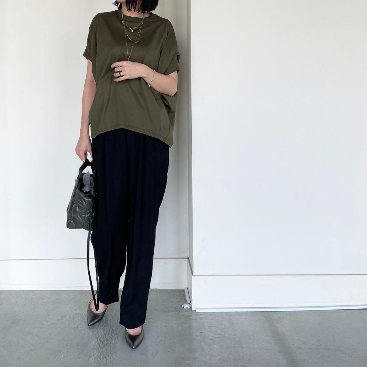 そろそろ秋が気になるな〜という季節にはブラックやネイビーのボトムスでちょっぴりダークなコーディネートにも◎。
