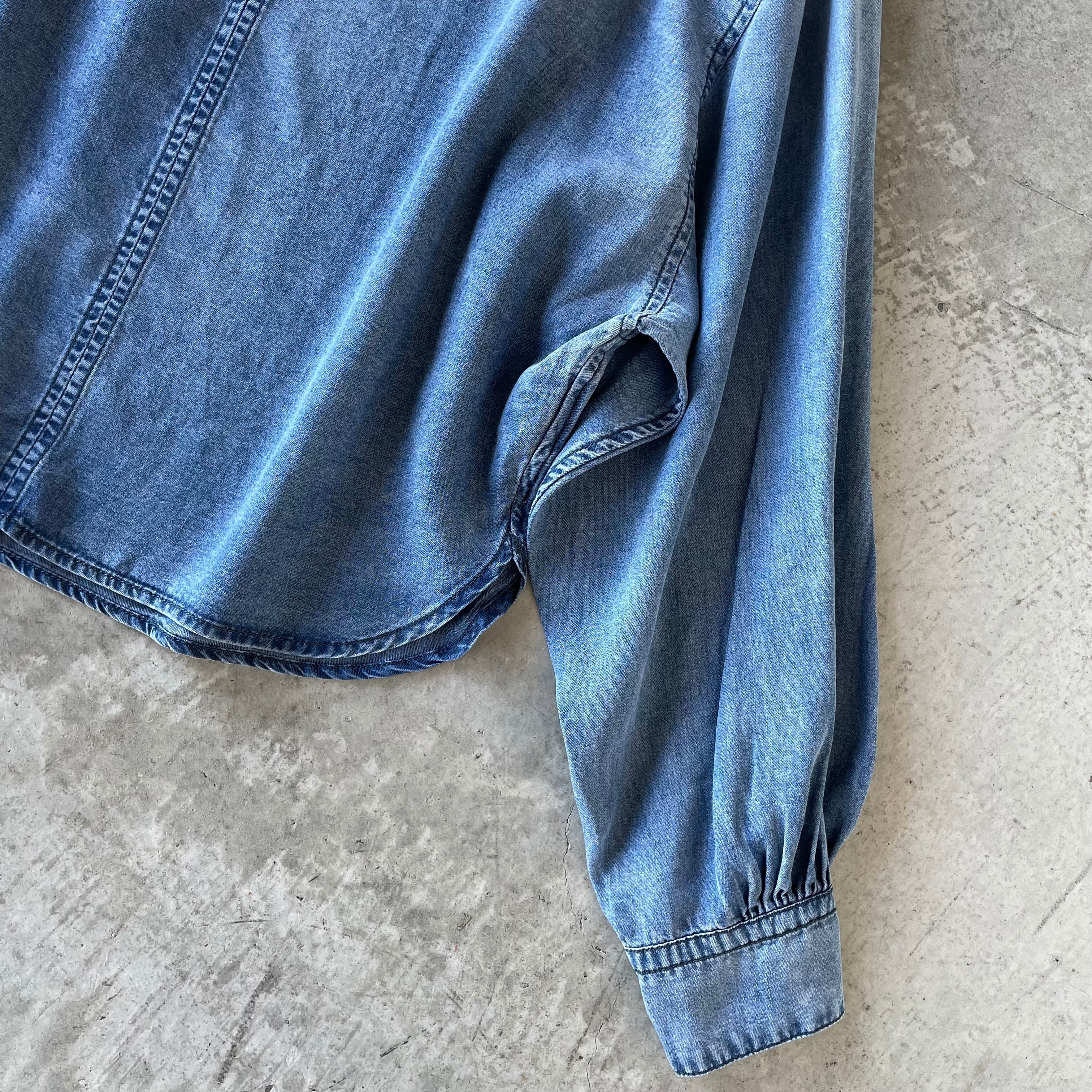 ゆったりとした身頃とややショートな丈感がかわいい、ダンガリーシャツブラウス。