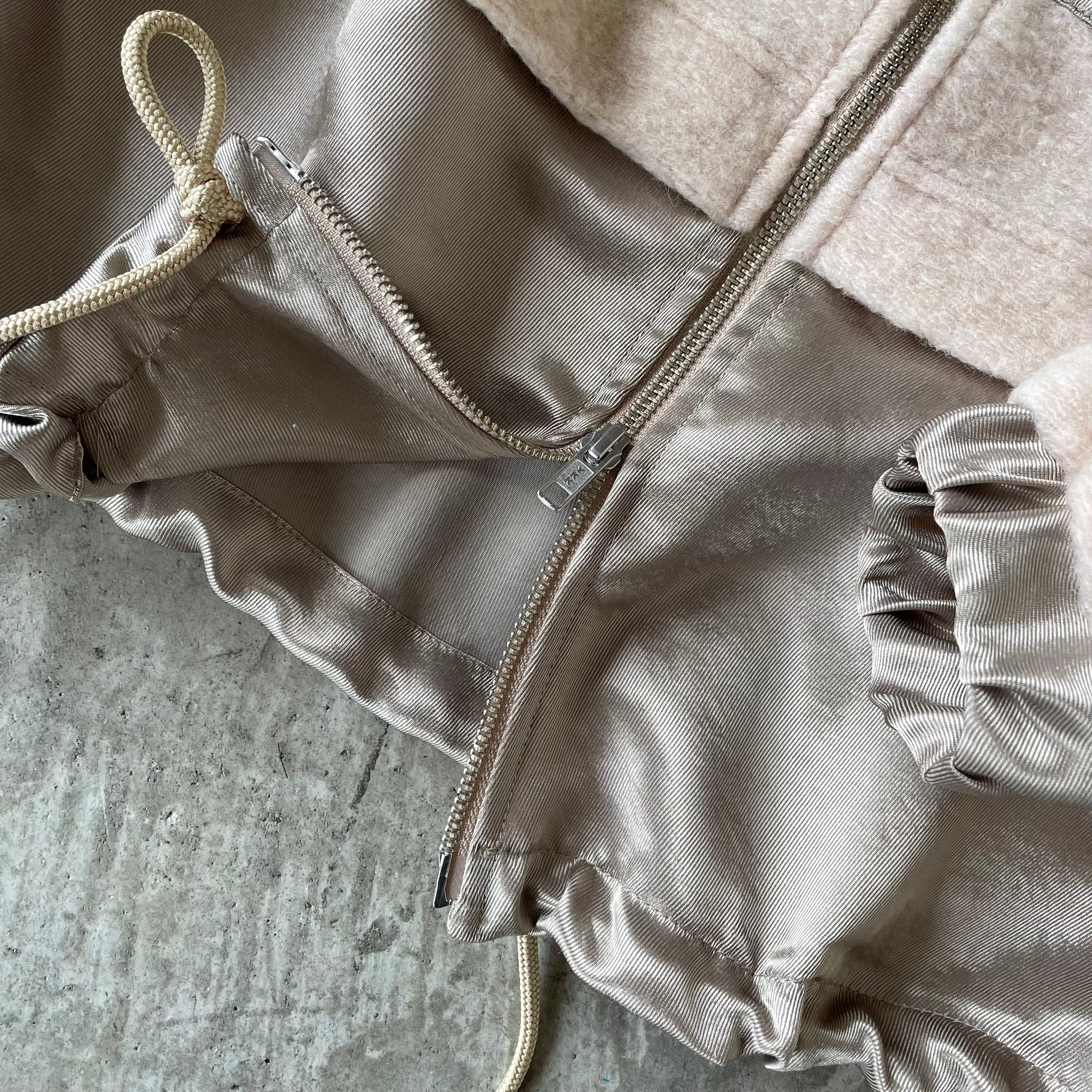 ウォーム感のある素材と深い光沢のあるサテン地とのコンビで、カジュアルの中にもキレイめ感をプラスしています。