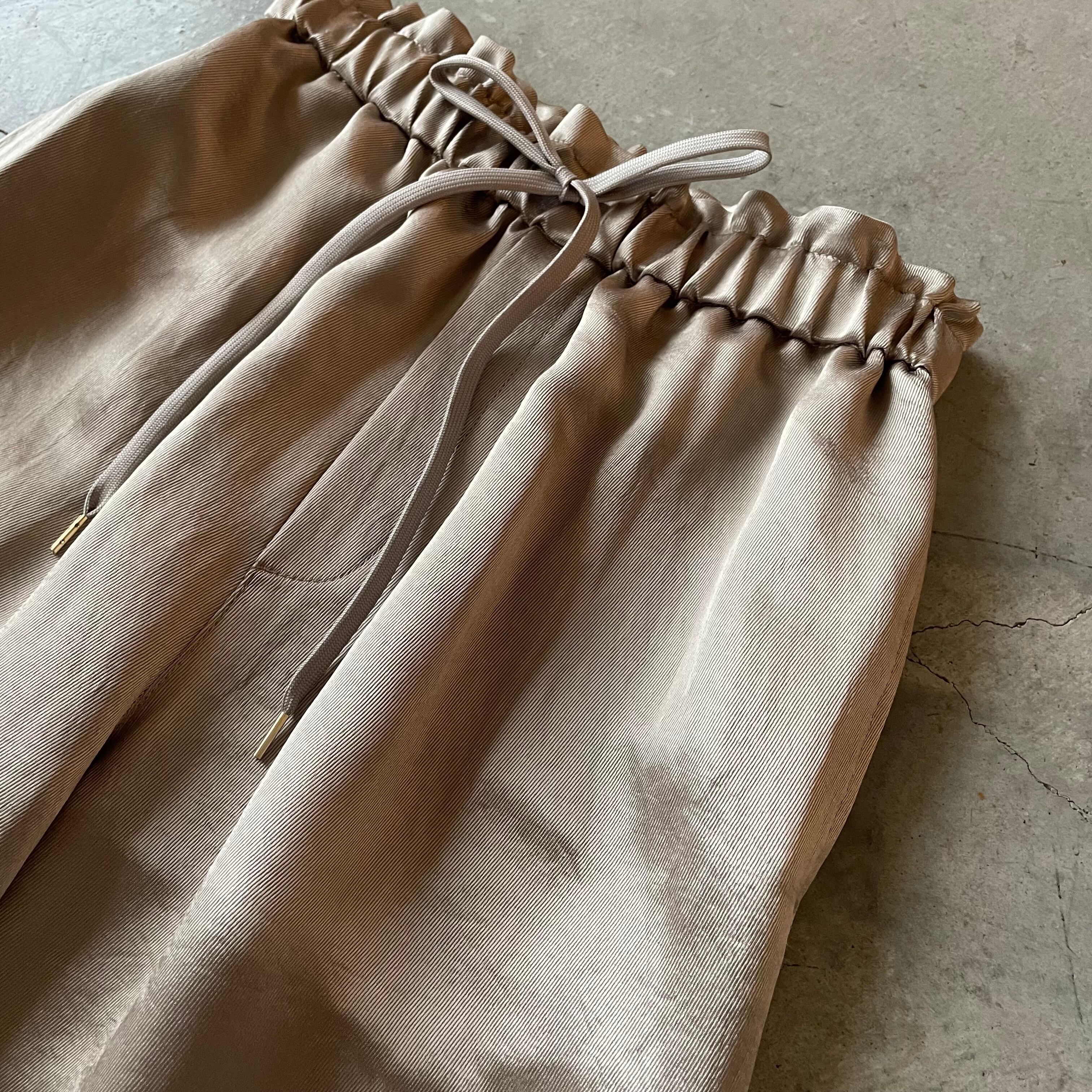 履き心地もよく、広がりすぎないストレートのようなセミワイドシルエットで、どんなトップスにも合わせやすいサテンパンツ。