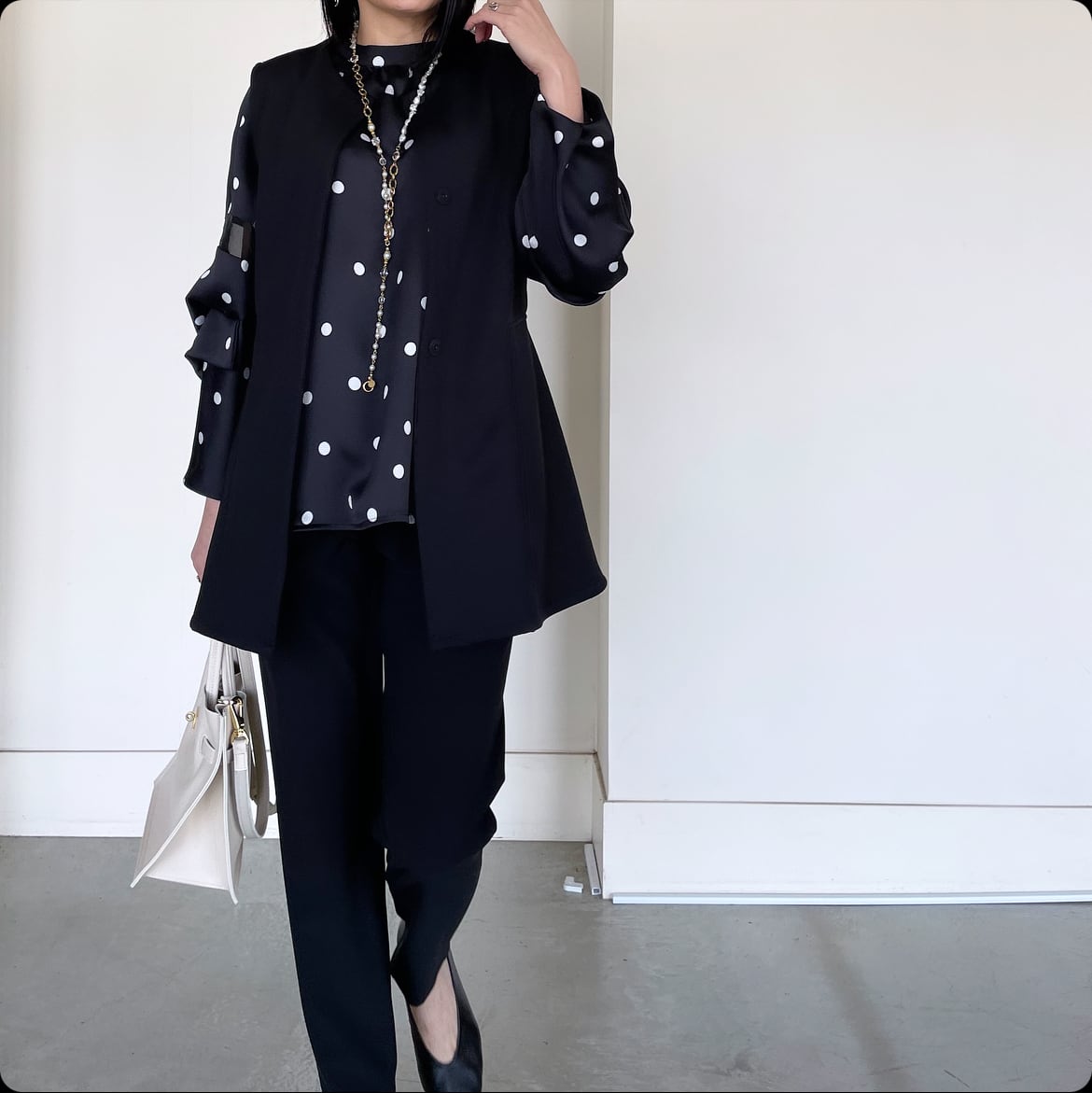 インナーにキレイめブラウスを合わせれば、入卒などのセレモニーコーデにも◎!