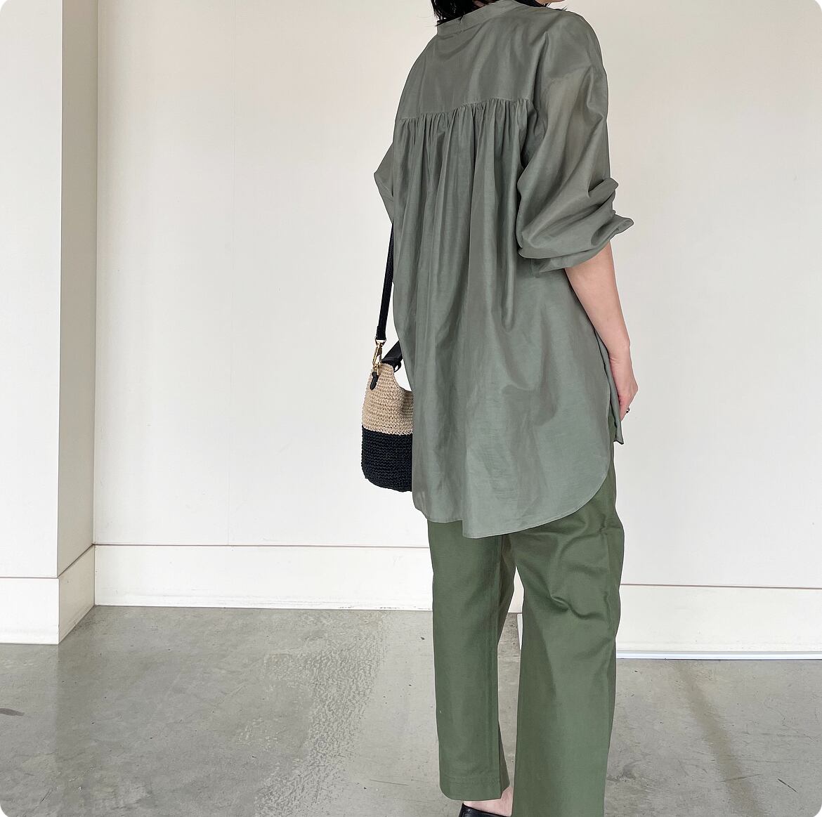 コットンシルクのさらっとした素材感で落ち感もあり、春〜秋まで活躍間違いなしなオススメブラウス。