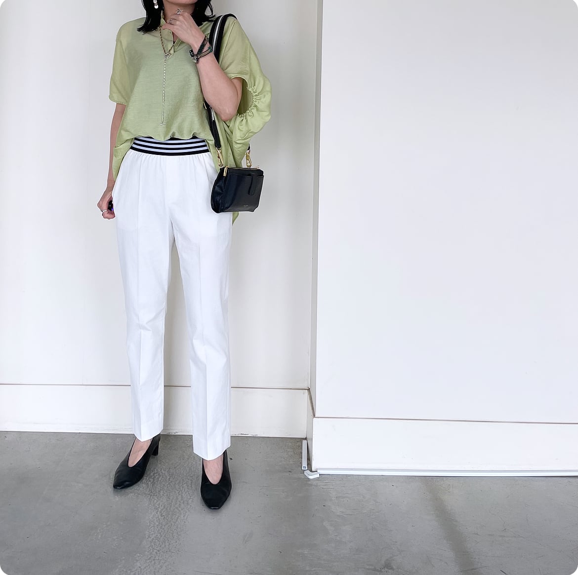 ホワイトパンツやデニムパンツにも好相性で、夏コーデをパッと華やかにしてくれるオススメブラウスです。