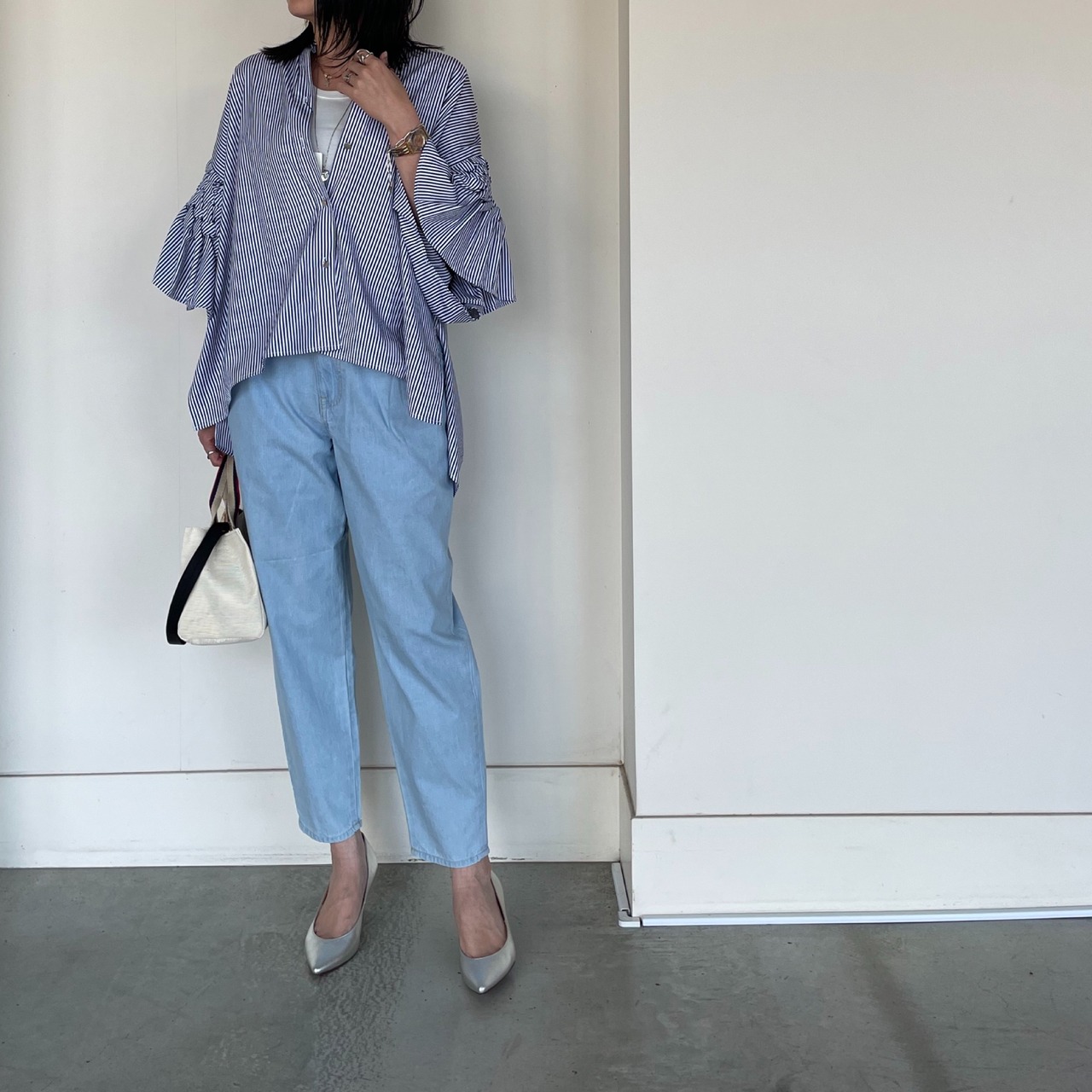 シャツならではのきちんと感をキープできるので、ボトムにはデニムアイテムで少し崩したコーディネートもオススメ◎!