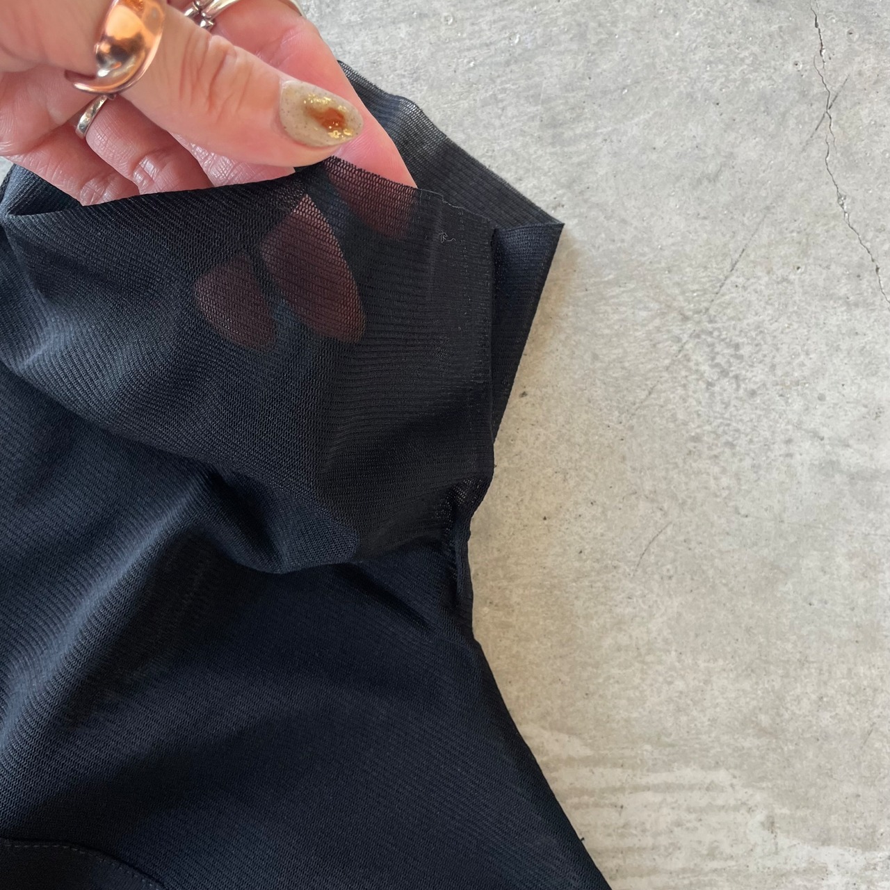 店頭でも大人気!絶妙袖丈で二の腕もスッキリ⭐︎シアーコンビ ハイネック5分袖トップスです。