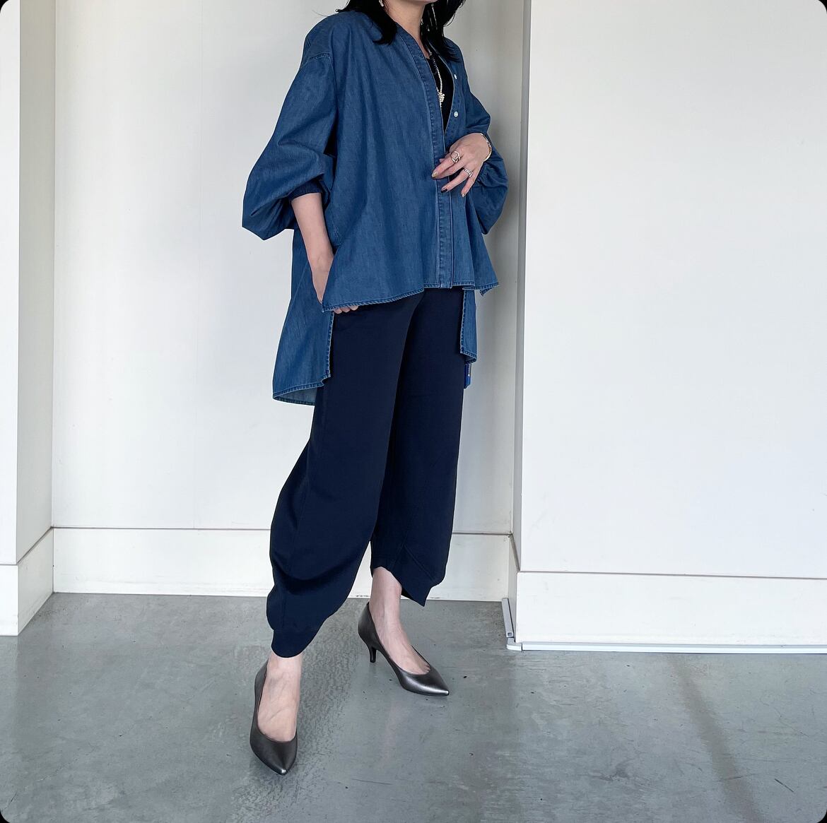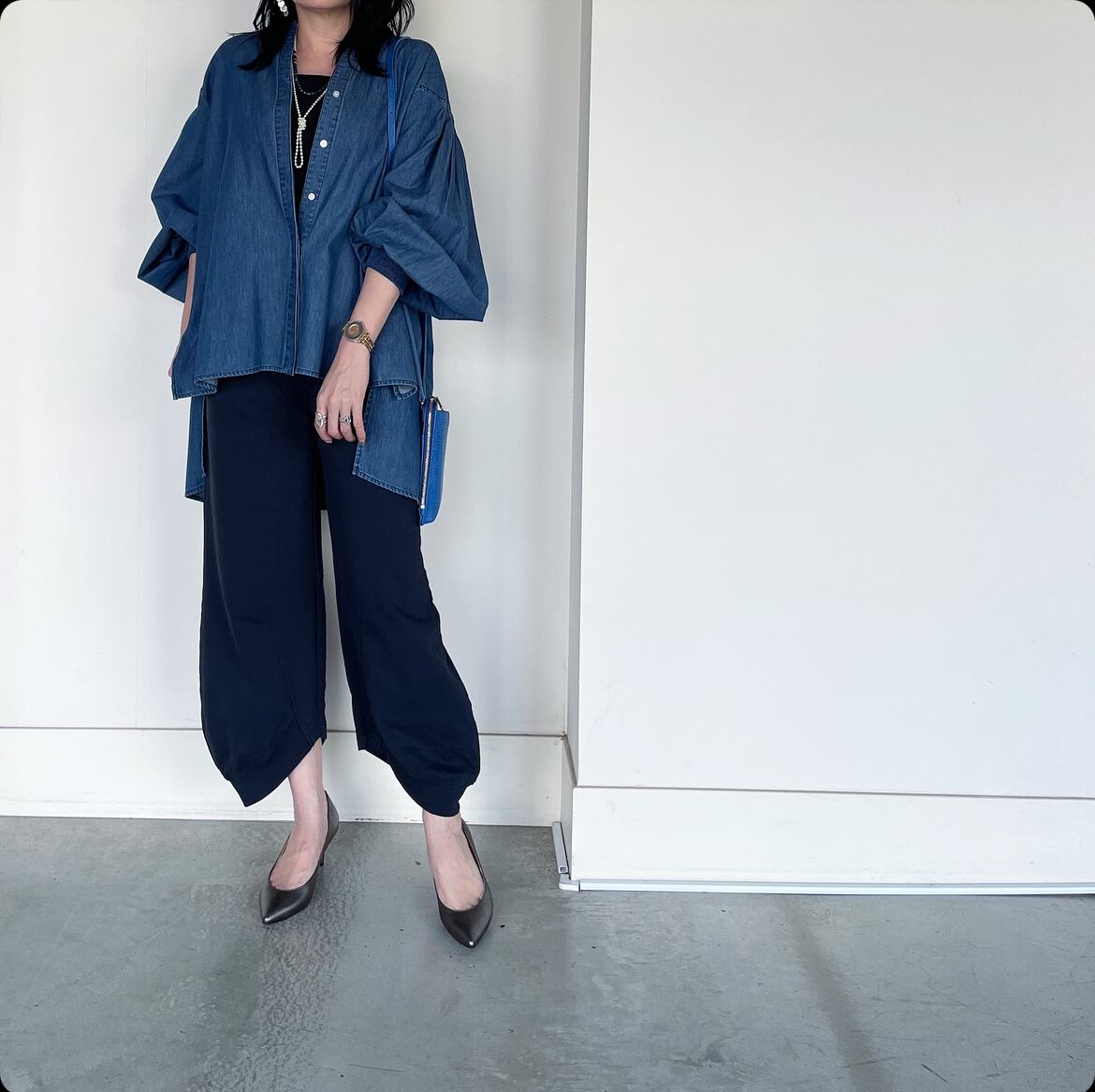 ダンガリー素材なのでカジュアルな印象で着られ、女性らしいシルエットながらも甘くなりすぎず、普段使いにもぴったりなアイテムです。