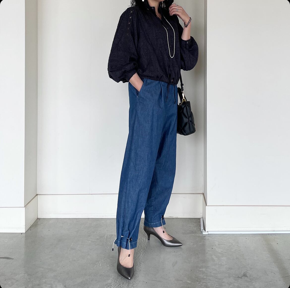 デニムパンツやチノパンなどのカジュアルアイテムにも、女性らしさをプラスしてくれるおすすめアイテムです。
