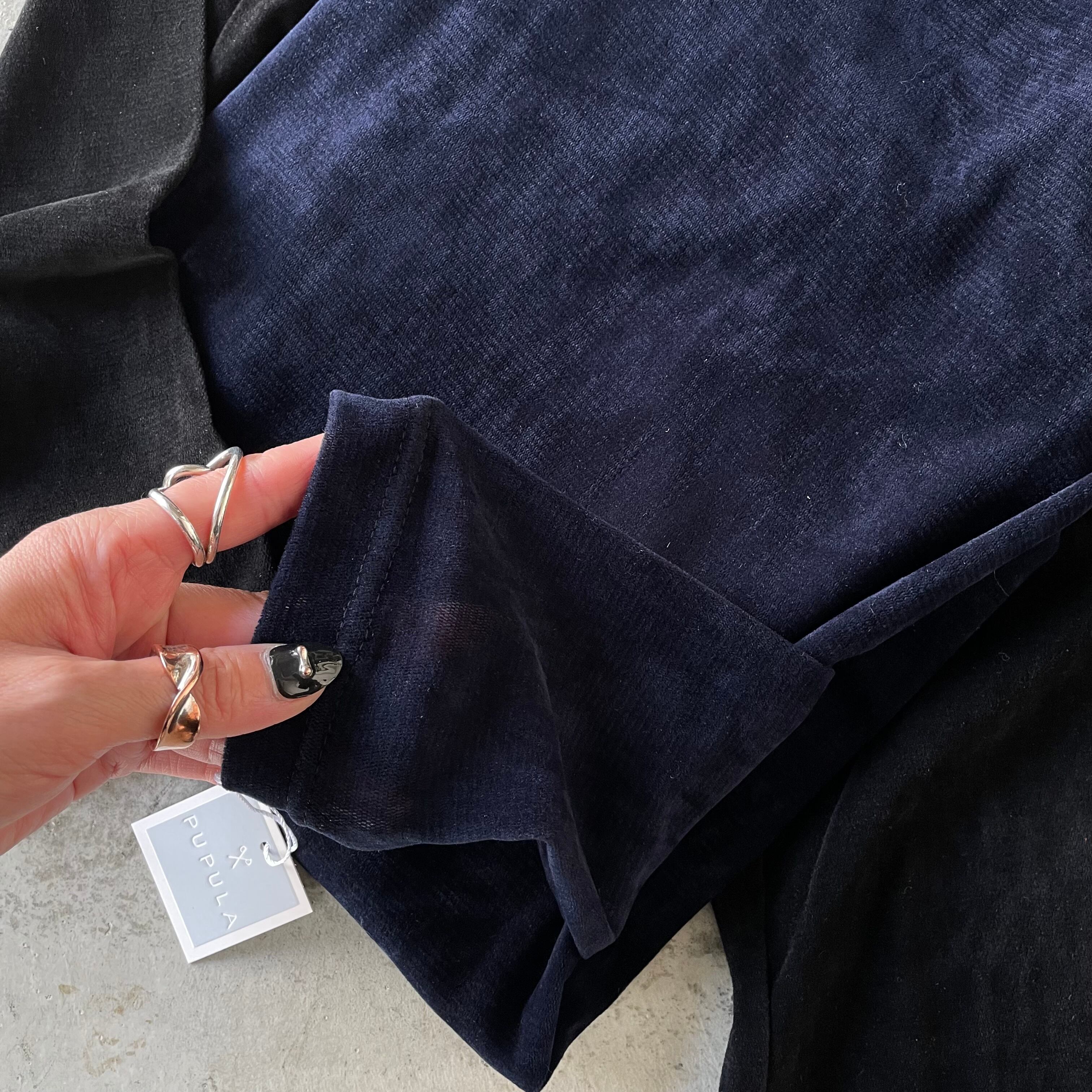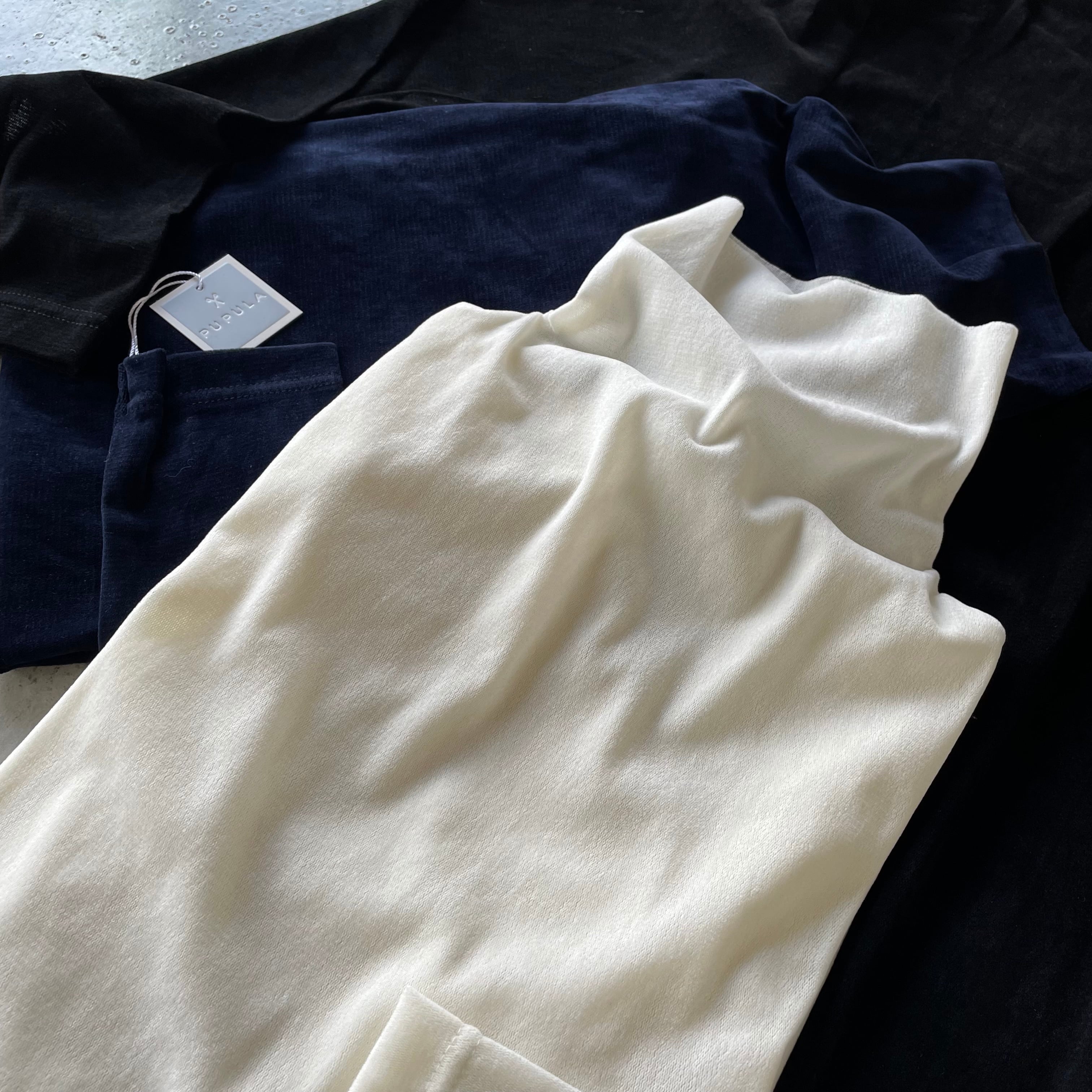 ニットにブラウス、ジャンパースカートにサロペットなど、色々なアイテムとのコーデにも相性抜群なオススメベロアインナーです。