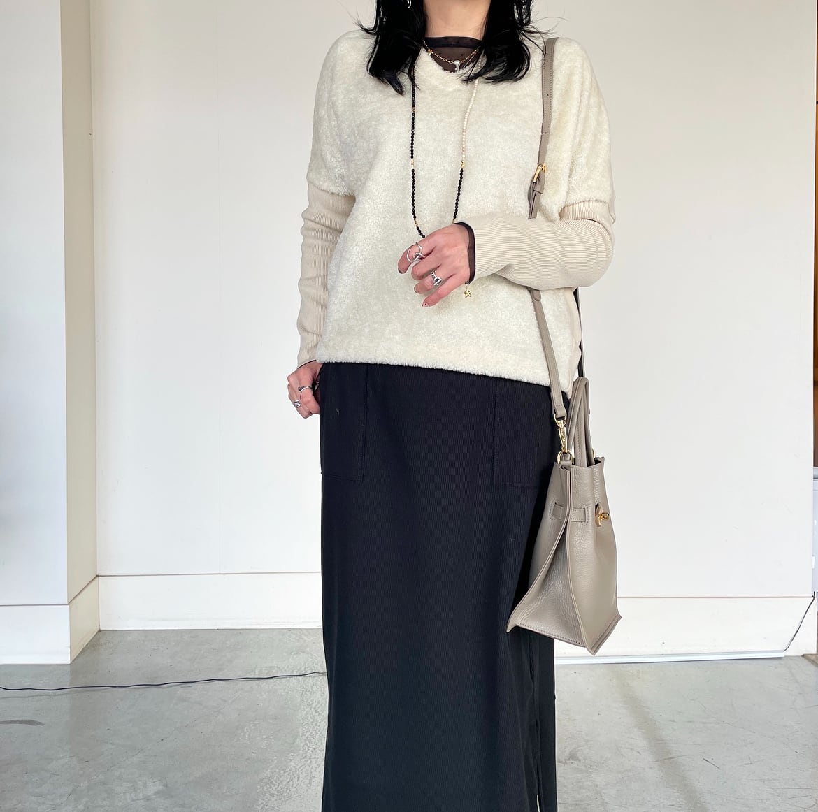 前身頃のふわふわの表情感が可愛らしい異素材切り替えのニットプルオーバー。
